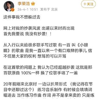4月1日,有网友爆料李荣浩创作的《小眼睛》抄袭了日本歌手平井竖的《signa》,李荣浩没等舆论彻底发酵,就率先回应,称《小眼睛》就是照搬了《signa》的曲。