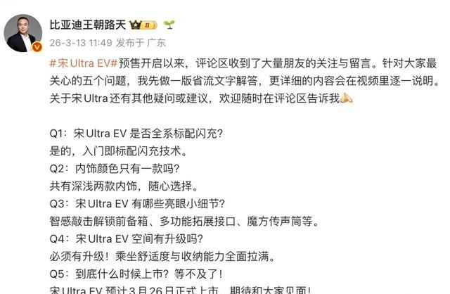 3月13日,比亚迪王朝官方表示,宋Ultra EV预计将于3月26日上市,且将全系标配闪充技术,此前该车公布的官方预售价为15.5-18.5万元,新车将拥有第二代刀片电池,并可选装激光雷达。